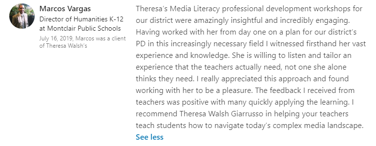 Over the last three years, Theresa Walsh Giarrusso, a journalist with 27 years of experience, has been working with teachers, students and senior citizens on these important skills. Her curriculum has been featured on CNN.com.